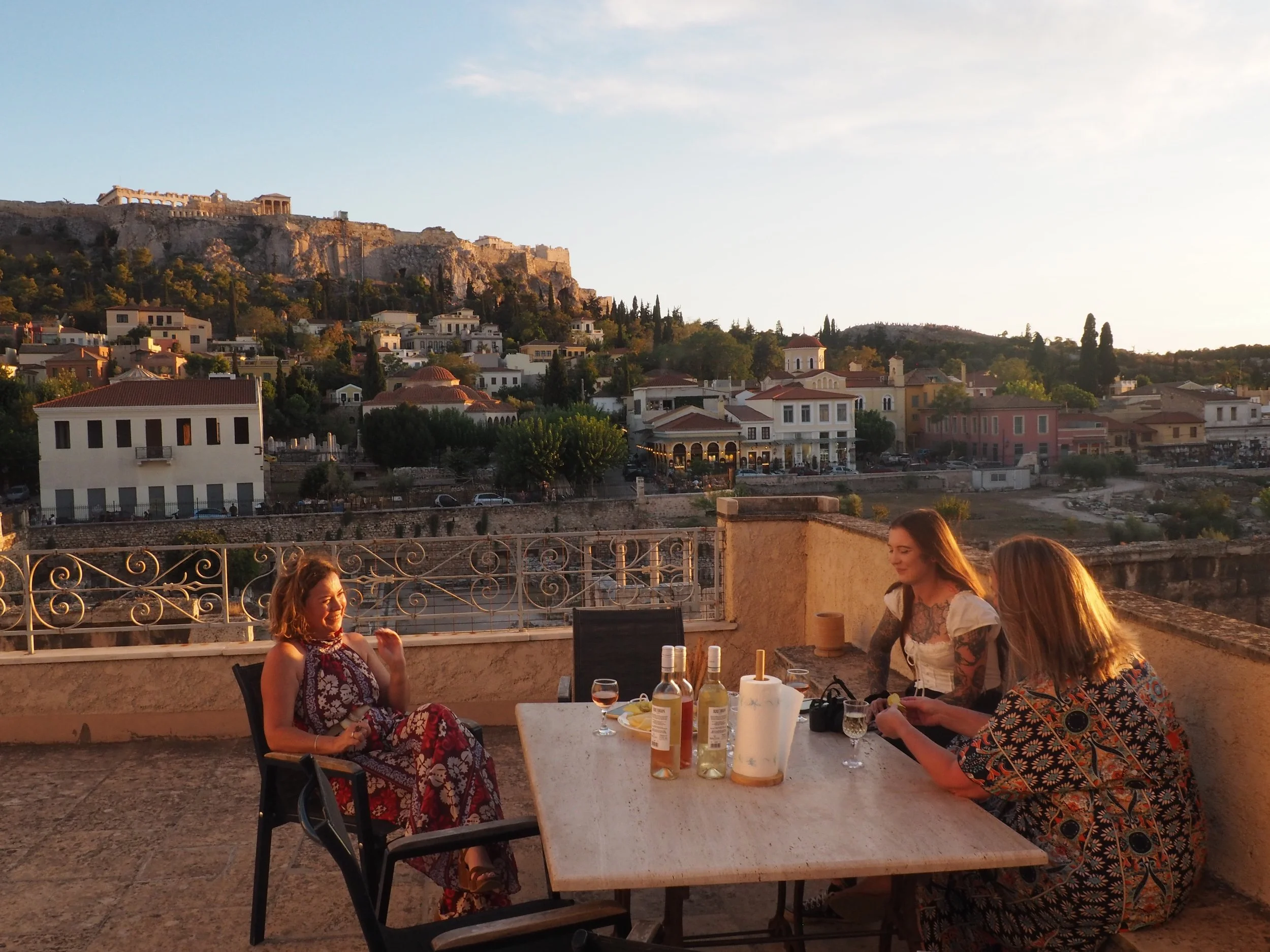 Three women sitting at a table on a rooftop terrace during sunset, with a view of a hillside neighborhood and ancient ruins in the background.